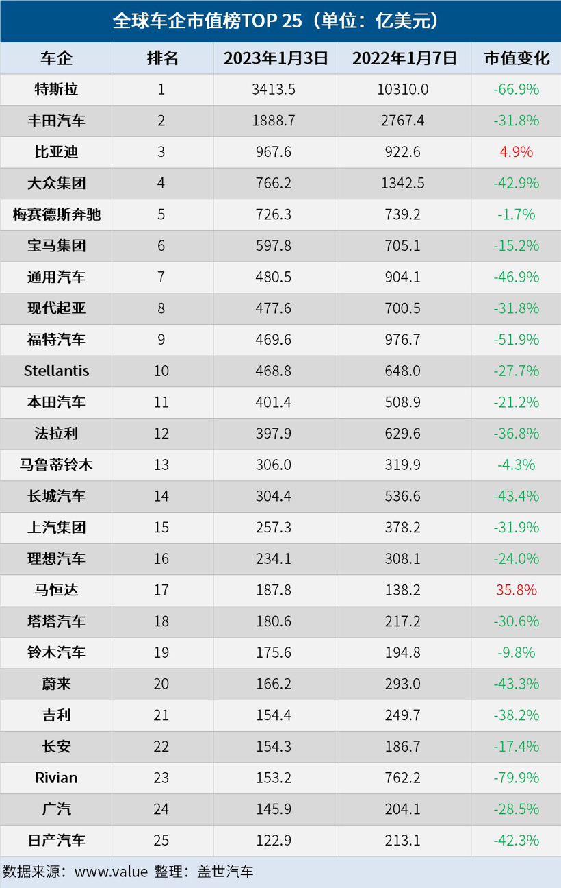 首先电动车领头羊特斯拉的股价在2022年摔了个大跟头,下跌近70%;蔚来的市值排名跌到第20位;许多曾经颇有前途的电动汽车初创公司甚至成了最大的输家,诸如Rivian、Lucid、Canoo和Nikola等公司股价均下跌75%以上。