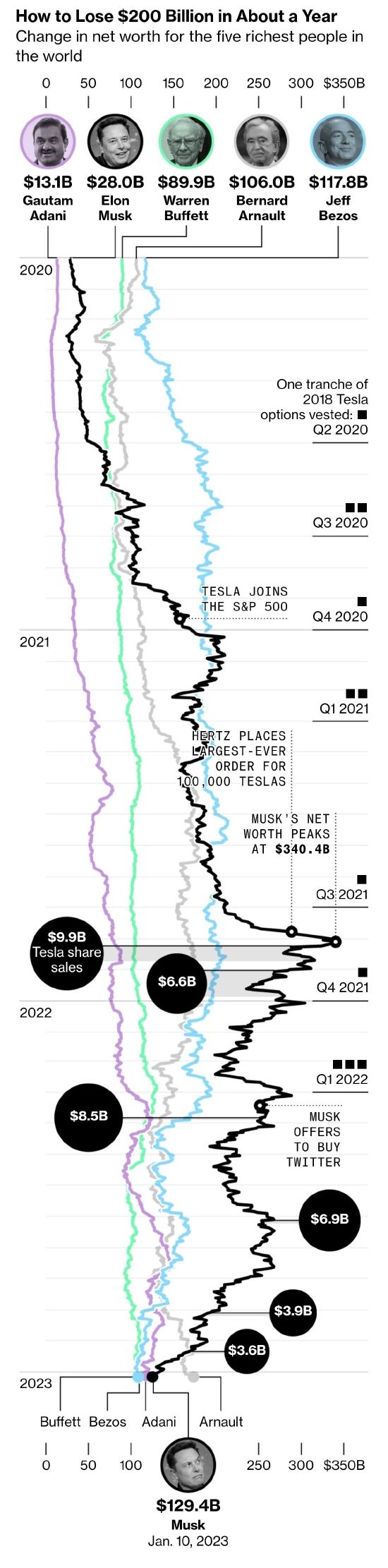 当然,即便是在特斯拉股价暴跌之后,马斯克还是有可能再度反超目前的世界首富贝尔纳·阿尔诺(Bernard Arnualt),并抵御印度能源大高塔姆·阿达尼(Guartam Adani)的竞争。