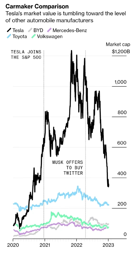 由于特斯拉面临激烈竞争,加之降价后的交付量仍未达到预期,导致该股自12月1日以来累计下跌39%。同期,以科技股为主的纳斯达克100指数跌幅仅为特斯拉的五分之一。而多年以来一直通过保证金贷款为自己筹集资金的马斯克,也很自然地丢掉了世界首富的宝座。根据彭博亿万富豪指数,马斯克目前的净资产约为1294亿美元,较巅峰时期缩水逾2100亿美元。