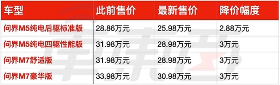 继特斯拉拿出历史最低价之后,华为问界也开始了降价。就在今天早上,问界官方发布消息称,从今天8点30分开始,问界的部分车型将会按照新价格出售,更新后问界M5纯电版本的售价为25.98~28.98万元,问界M7的售价为28.98~30.98万元,整体降价幅度为2.88~3万元之间。