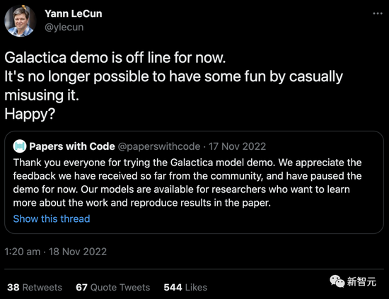 LeCun转发了Papers with Code的通知,像个‘大怨种’一样说道:‘现在我们再也不能和Galactica一起愉快地玩耍了,你们开心了?’
