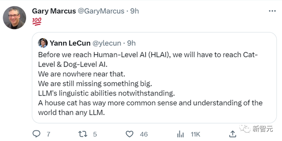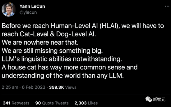 他再次发推称:‘在我们做出人类级别的AI之前,我们需要先做出猫猫/狗狗级别的AI。而现在我们甚至连这都做不到。我们缺失了十分重要的东西。要知道,连一只宠物猫都比任何大型语言模型有更多的常识,以及对世界的理解。’