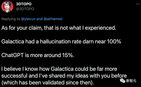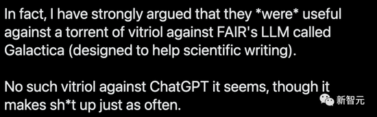 他在Twitter中十分意难平:‘ChatGPT满嘴胡诌,你们却对它如此宽容,但我家的Galactica,才出来三天,就被你们骂到下线了。’