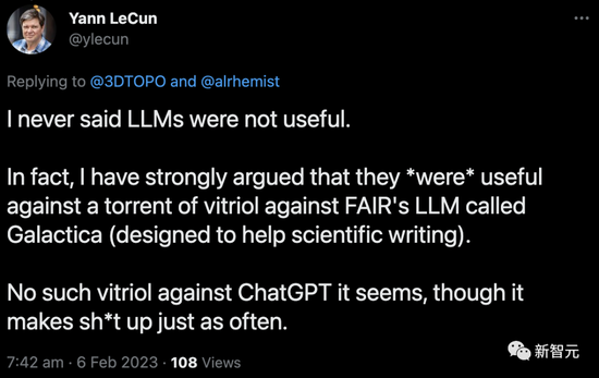 对于网友的痛击,LeCun再次发推表明态度:‘我从来没说大型语言模型没用,其实我们Meta也推出过Galactica模型,只是它不像ChatGPT那么好命罢了。ChatGPT满嘴胡诌,你们却对它如此宽容,但我家的Glacatica,才出来三天,就被你们骂到下线了。’