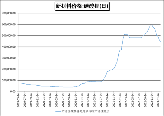 另一方面,可以看到,宁德时代此次主动降价,也是因为电芯成本已下行明显,为降价提供了足够的空间。自去年11月以来,以碳酸锂为代表的电池上游原材料价格开始高位跳水,直到目前仍处于下跌模式。