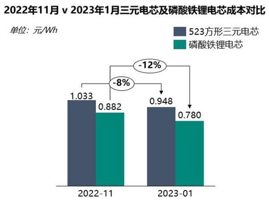 最后组成电芯成本,与2022年11月相比,2023年1月的镍钴锰523方形三元电芯成本已从1.033元/Wh下滑至0.948元/Wh,跌幅为8%。方形磷酸铁锂电芯成本自0.882元/Wh下跌至0.78元/Wh,下滑幅度达到了12%。
