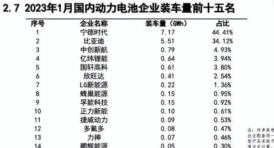 2023年1月,宁德时代电池装车量为7.17GWh ,市场占比44.41%,同比下降高达5.8个百分点;比亚迪的电池装车量为5.51GWh,市场占比为34.12%,同比增加13.19个百分点。比亚迪的电池装车量与宁德时代电池的装车量之比,已经由2021年1月的24.5%,已经飞升为2023年1月的75%。