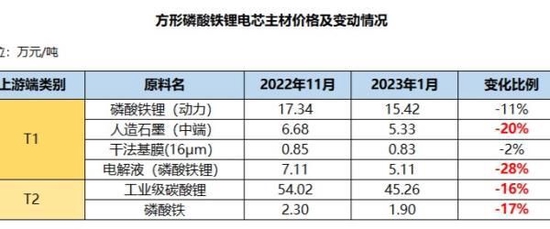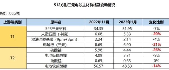 传导到电芯主材上,正极材料方面,镍钴锰523三元锂材料与磷酸铁锂(动力)型的均价较去年11月下滑幅度分别为7%和11%。