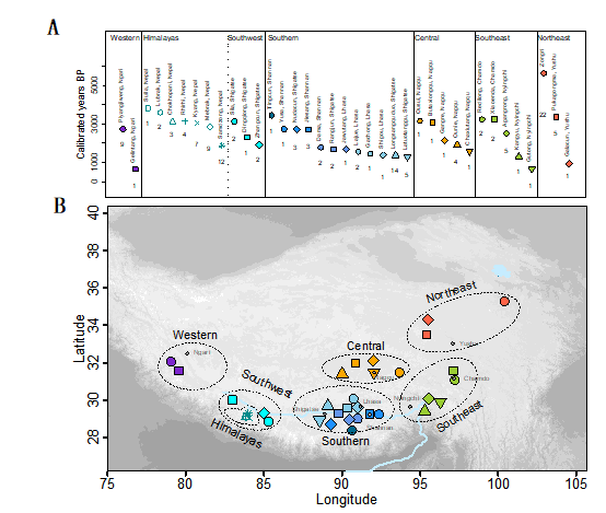 (A-B)研究涉及青藏高原古人群的年代及地理分布
