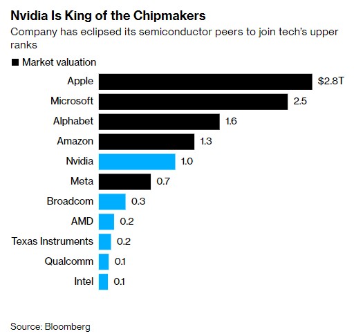 并且,这一增长还使英伟达成为第一家估值超过1万亿美元的芯片制造商。在2020年,英伟达的市值才首次超过英特尔,但如今,两家公司甚至没有再接近过。目前仅有少数几家家喻户晓的大型科技公司的市值仍高于英伟达。