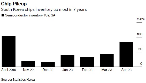 根据韩国统计局周三的数据,4月份库存同比增长83%,这是自2016年4月以来的最大增幅,跟踪库存的指数跃升至创纪录水平。与此同时,数据显示,工厂发货量较上年同期下降33%,产量减少20%。韩国政府公布的数据显示,韩国半导体库存创下7年来最大增幅,突显出尽管全球人工智能发展蓬勃,但对芯片的需求仍在持续疲软。