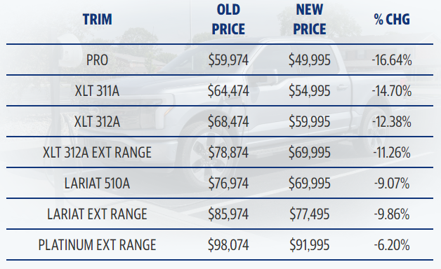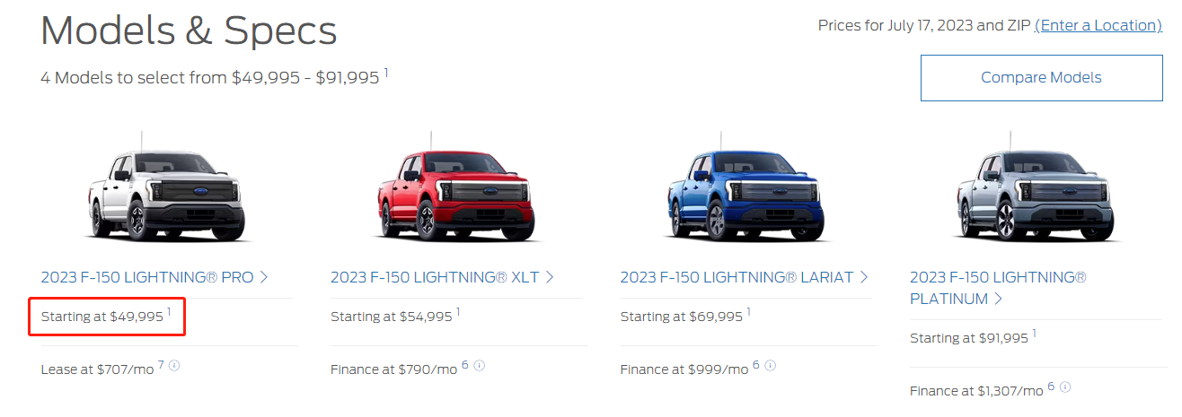 具体来看,入门级车型F-150 Lightning PRO的最新起售价为49,995美元,先前为59,974美元,下调幅度约为1万美元,占原先车价比例的16%;最高端的Platinum车型的最新起售价为91,995美元,先前为98,074美元,下调幅度超过了6%。