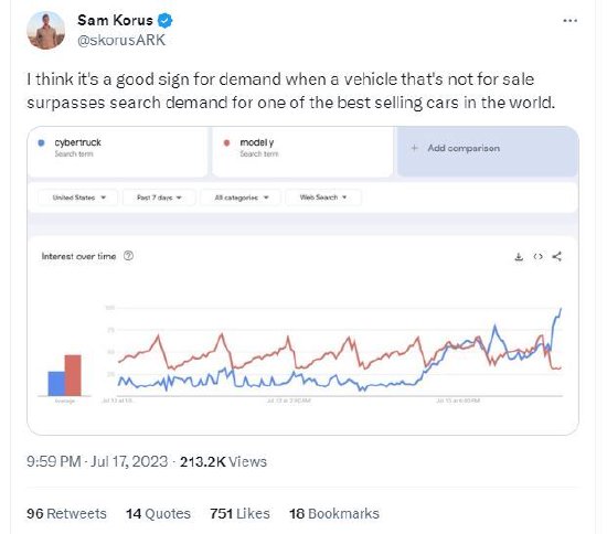 科鲁斯在推特上写道:“我认为,当一辆尚未开始销售的汽车超过了对世界上最畅销车型之一的搜索需求时,这是需求的一个好迹象。”