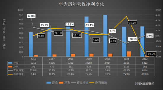 新浪科技梳理华为历年财报发现,2021年和2022年华为可谓遭遇了多年来最大的财务挑战。2021年,华为营收同比下滑28.6%,至2022年实现同比微增0.9%;在净利润方面,华为2022年同比下滑69%,虽然存在着2021年华为因出售荣耀等净利润大增的情况,但与其他年份相比也出现了净利润大幅下降。
