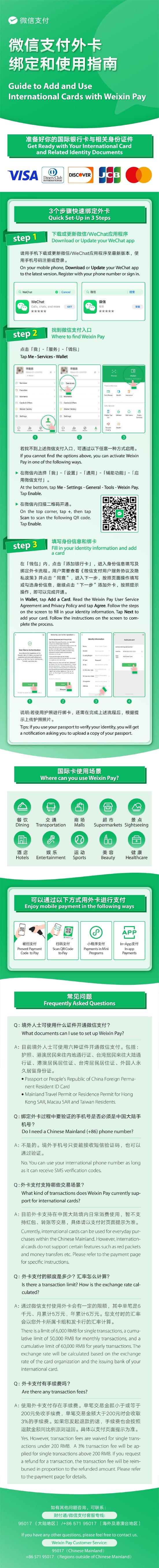 此次开放微信支付商户网络之后,入境人士通过护照、港澳居民来往内地通行证(回乡证)、台湾居民来往大陆通行证(台胞证)、港澳居民居住证、台湾居民居住证、外国人永久居留身份证开通微信支付,绑定国际银行卡,即可在逾千万家中小商户便捷消费。为支持用户小额高频的消费需求,对于单笔交易金额人民币200元及以下的国际卡交易,微信支付承担国际卡交易相关费用,免收用户交易手续费(具体以支付页面提示为准)。