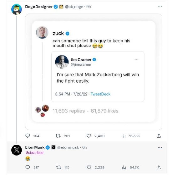 一个名为“Dogedesigner”的X用户分享了扎克伯格在Threads上的一条帖子的截图,后者在回应美国知名股评人吉姆·克莱默预测他将“轻松”赢得与马斯克的格斗时称:“有人能让这个家伙闭嘴吗,拜托。”
