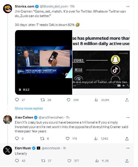 此前一天马斯克回应了一位X用户的帖子,同意他的说法,即如果他总是沿着与克莱默的建议相反的反向来投资股票,那么早就成为地球上首位万亿美元富翁了。