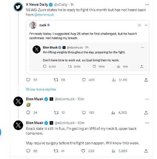 马斯克当地时间周日晚间发帖称,他和扎克伯格进行格斗的日期尚未确定,并称自己的颈部和背部有一些问题,可能需要手术才能开战。一位X用户转发了扎克伯格在Threads上发布的帖子截图,后者称他已经准备好了与马斯克格斗,并曾建议将日期定在8月26日,但马斯克还没有确认。