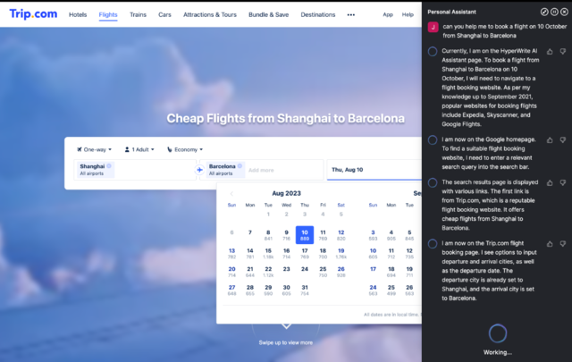 华尔街见闻也试用了HyperWrite,测试了一下这一助手是否可以帮忙预订机票。助手会向我解释每一步,这也就是所谓的思维过程提示——通过帮助LLM推理问题而提高性能。在需要个人信息的网站上代理会暂停:如登录页面或信用卡信息。