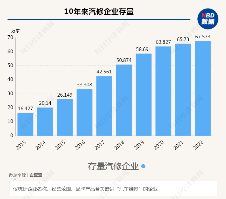 截至2023年7月底,国内汽车维修相关企业存量仅68万家(仅统计企业名称、经营范围、品牌产品含关键词“汽车维修”的企业)。