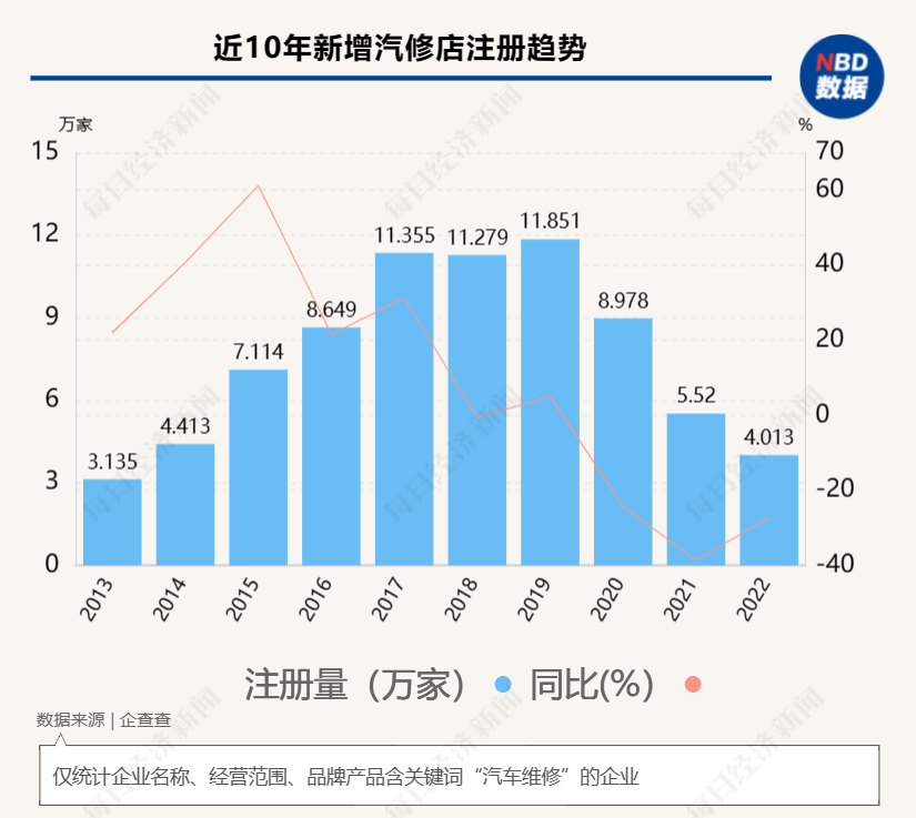 一组数据也映射出汽修行业的生存状态。企查查数据显示,2020年-2022年,国内汽车维修相关企业每年注册量都呈下滑趋势,分别注册8.98万家、5.52万家、4.01万家,同比下降24.24%、38.51%、27.3%。
