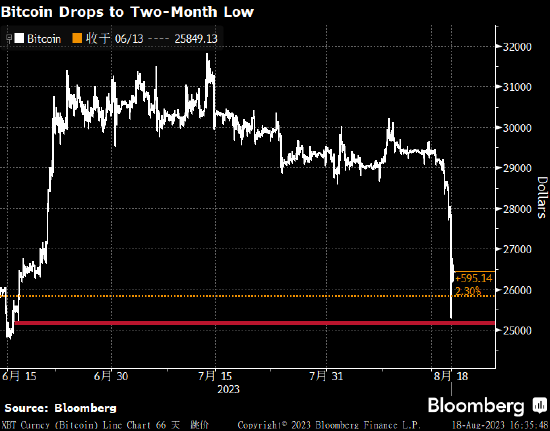 由于投资者预测利率将在更长时间内升高,加密货币跌幅扩大,与全球风险资产一道下挫。有关马斯克旗下SpaceX出售比特币持仓的报道也加剧了市场担忧。周五香港时间15:00,比特币跌4.1%,之前一度触及25314美元低点,势创三个月来最大周跌幅。一天前比特币开始从28947美元回落,当日全球债券收益率触及多年高点,降低了数字代币等另类投资的吸引力。