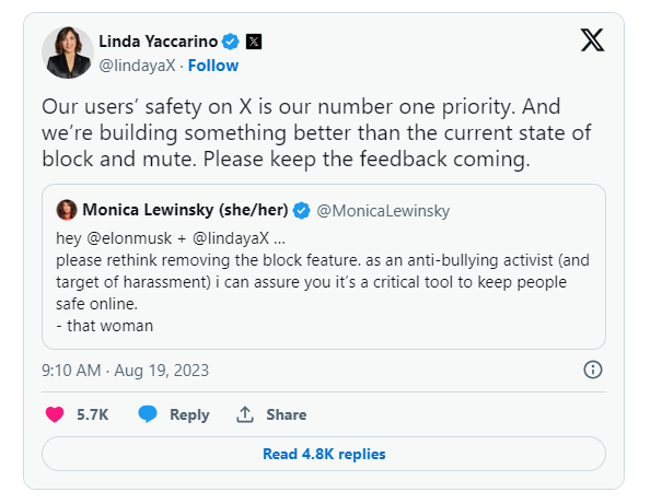 针对反欺凌活动人士Monica Lewinsky敦促X保留“确保人们在线安全的关键工具”的帖子,X首席执行官Linda Yaccarino为马斯克的举动进行了辩护。