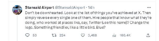 一名用户讽刺地回复道:“别灰心。看看你在X取得的成就。然后只要把它们一一反转过来。雇佣那些知道自己在做什么的人,比如在Twitter工作过的人,恢复这个名字?更改标识。用一些更友好的,比如一只小鸟。蓝色的?”