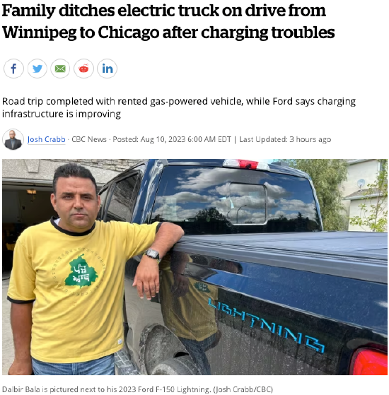加拿大一位福特“闪电”皮卡的车主在驾驶这辆电动皮卡前往美国旅行的途中,因为充不上电而被迫改用燃油车完成旅行。这个故事表明,北美电动汽车充电基础设施亟待改善。这位名叫Dalbir Bala的车主住在加拿大曼尼托巴省的La Salle镇,今年1月,他以11.5万加元(税后)的价格购买了一辆2023款福特F-150“闪电”皮卡。