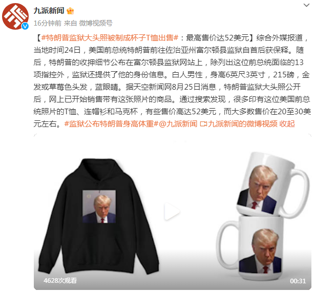 据天空新闻网8月25日消息,特朗普监狱大头照公开后,网上已开始销售带有这张照片的商品。通过搜索发现,很多印有这位美国前总统照片的T恤、连帽衫和马克杯,有些售价高达52美元,而大多数售价在20至30美元左右。
