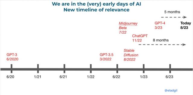 现在距ChatGPT唤醒世界进入AI新时代仅8-9个月的时间,随着我们沿着这一技术非线性地走下去,激动人心的时刻就在前方。现在是人工智能的早期阶段,炒作和影响的高峰都还在未来。还有更多的事情要做。