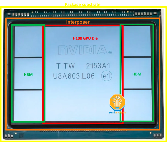 在H100最中心的逻辑芯片旁边,是6块HBM(High Bandwidth Memory),它一种基于3D堆叠工艺的DRAM内存芯片,像摩天大厦中的楼层一样可以垂直堆叠,将多个DDR芯片堆叠在一起,通过硅通孔(TSV)连接,并使用 TCB 键合,实现更高带宽、更高位宽、更低功耗、更小尺寸。