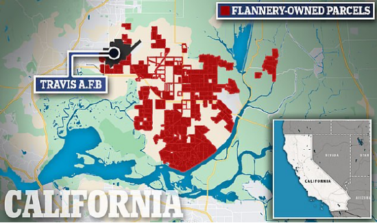 在接到当地农场主报告之后,索拉诺地区的Fairfield市长和联邦众议员下令调查这个在当地收购土地的神秘买家,最终发现Flannery在五年时间已经斥资超过9亿美元,从当地400多家土地所有者那里购买了140块土地,总面积超过了5.5万英亩(约合222平方公里)。
