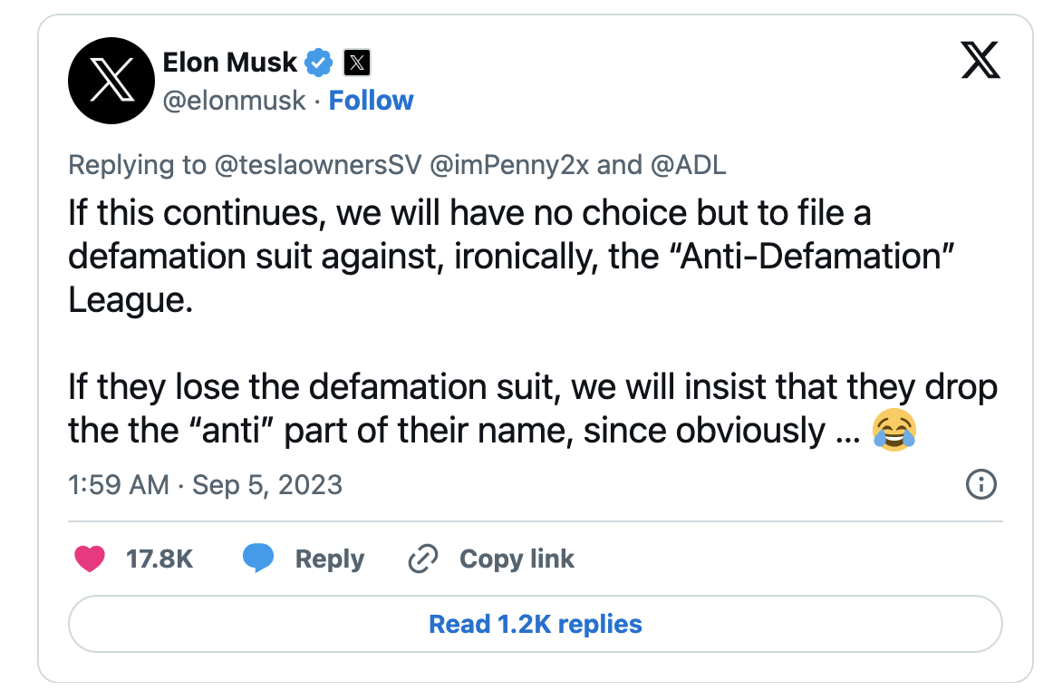 马斯克表示,自从他去年买下X以来,这家非营利组织一直在“试图扼杀”该平台,指责该平台和他是反犹太主义者。