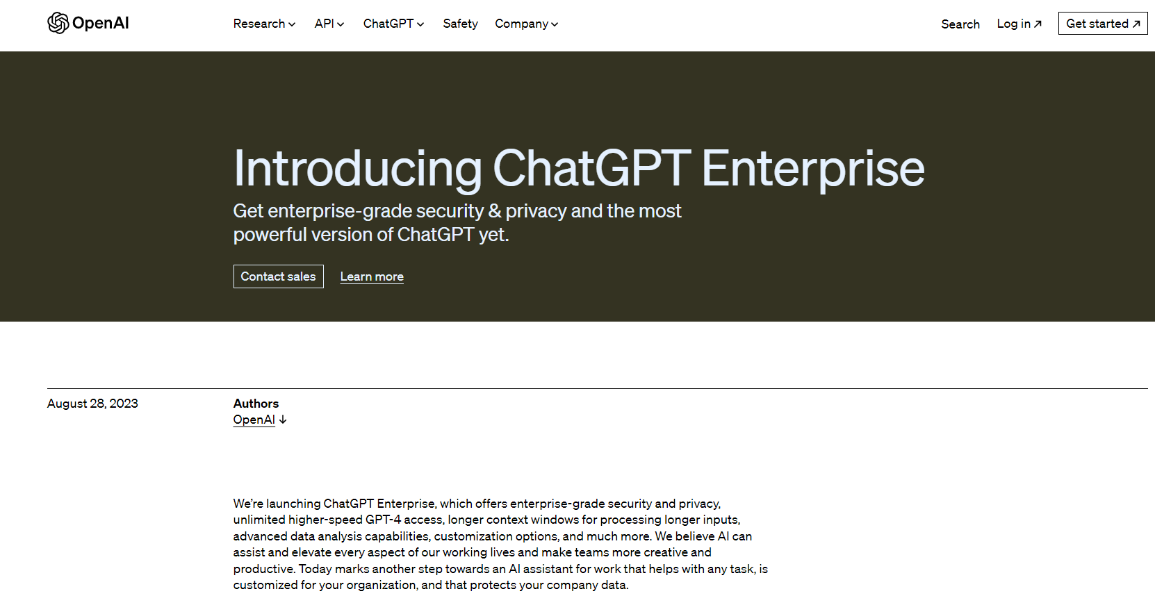 当地时间8月28日,OpenAI宣布将推出ChatGPT企业版,可提供更高级别的安全和隐私,对话数据不会用于模型训练,其执行速度将是普通版GPT-4的两倍。