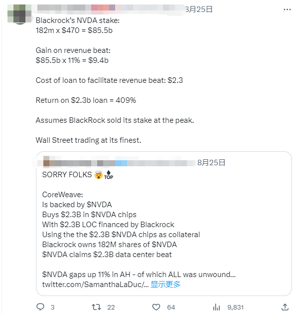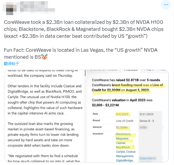 就着这个故事,推特上的“网络股评家”们凑出了这样一条逻辑:贝莱德、黑石、Magnetard借了23亿美元给CoreWeave买英伟达的H100芯片,随后英伟达的财报又恰好因为“美国业务增长”超出预期23亿美元。