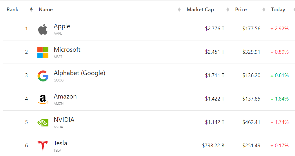 目前,苹果、微软、谷歌和亚马逊都是“1万亿美元市值俱乐部”的成员。截至收盘,苹果的市值为2.77万亿美元,微软为2.45万亿美元,而谷歌母公司Alphabet的市值为1.71万亿美元,亚马逊为1.42万亿美元。