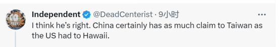 “我认为他是对的。中国当然对台湾拥有主权,就像美国对夏威夷拥有主权一样。”