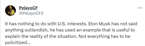 “这与美国利益无关。埃隆·马斯克并没有说什么奇怪的话,他举了一个有助于解释现实情况的例子。并不是所有事情都必须被政治化……”