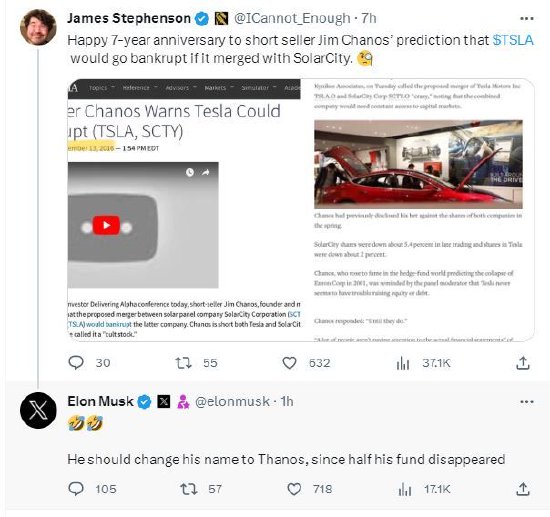 马斯克周四在X平台上调侃称,一向看空特斯拉的大空头吉姆·查诺斯( Jim Chanos)应该改名为Thanos(漫威漫画中超级反派灭霸的名字),因为他做空特斯拉一半的资金都不见了。马斯克是在回应一位X用户,后者发帖称:“大空头查诺斯预言特斯拉破产七周年快乐,他曾说过如果特斯拉与SolarCity合并将会破产。”