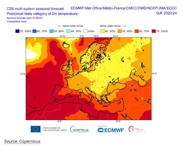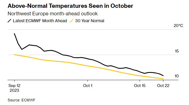 今年,由于冬季的又一个温暖开端推迟了供暖需求,欧洲天然气可能很快将出现供过于求的局面。欧洲联盟气候监测机构哥白尼气候变化服务项目的数据显示,在最近的热浪之后,10月份的气温将高于正常水平,此后的几个月西欧天气也可能继续温和。