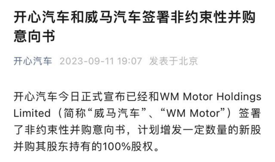 峰回路转的是,很快又有白衣骑士踩着七彩祥云出现。9月11日,开心汽车宣布称:和威马汽车签署了非约束性并购意向书,计划增发一定数量的新股并购其股东持有的100%股权。
