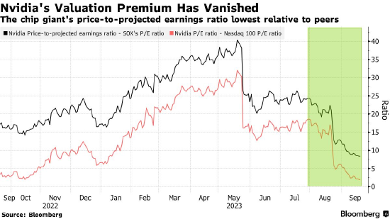 如今,英伟达的市盈率,与费城半导体指数(PSI)和纳斯达克100指数的市盈率之间的差距已创下新低。目前,英伟达的预期市盈率已跌至30倍以下,为一年来的最低水平。英伟达上个季度令人瞠目结舌的业绩预期推高了其盈利预期,而近期,其股价上涨已陷入停滞。