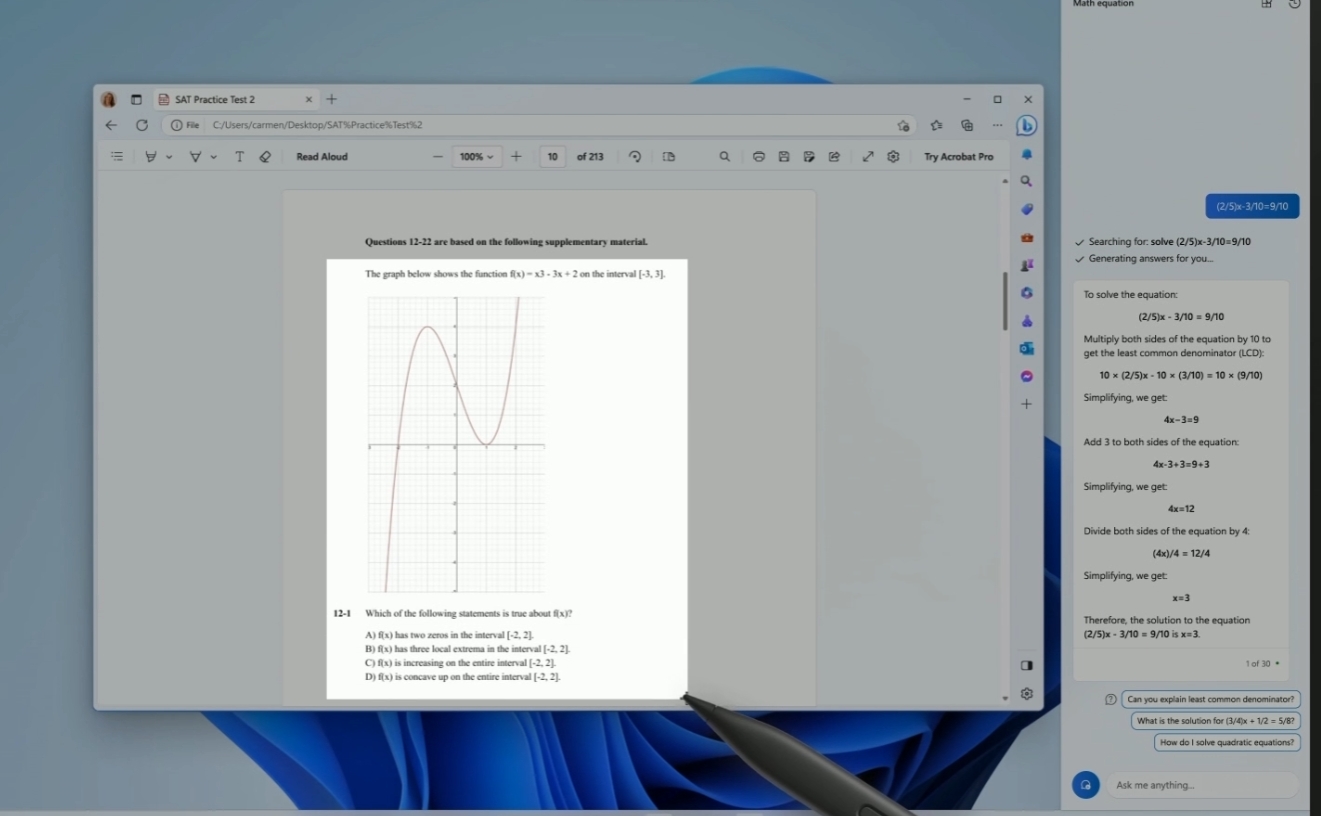 在今天的发布会上,微软还发布了一个名为Ink Anywhere的新功能。除了可以用手写笔书写数学等式提问外,手写笔还能直接选中带图片的数学问题,交给Copilot进行解答。