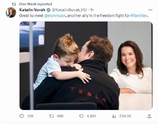 几小时后,诺瓦克发布了她与马斯克会谈时的另一张照片,照片中,马斯克3岁的儿子X趴在父亲肩头,背向这位女总统,仿佛是有些害羞。马斯克转发了这条推文。