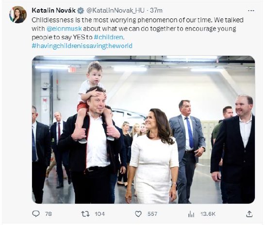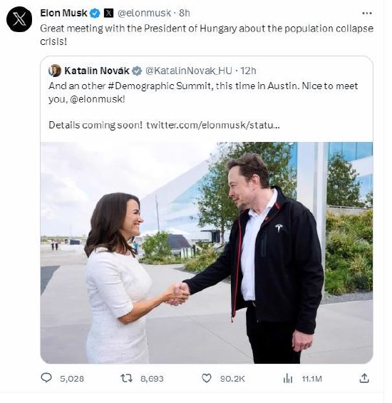 当地时间周一,马斯克在特斯拉位于美国德克萨斯州奥斯汀超级工厂的总部会见了匈牙利总统卡塔林·诺瓦克(Katalin Novak)。马斯克转发了诺瓦克在X平台上发布的两人会见的照片,并写道“与匈牙利总统就人口崩溃危机进行了很棒的会谈!”