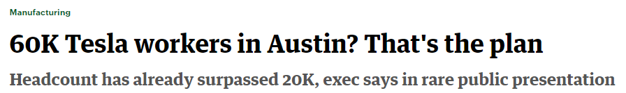 近期有消息称,电动汽车龙头特斯拉年内在得克萨斯州新雇佣了大批工人,目前得州超级工厂的员工已经超过了2万名,较去年年底上升逾六成。这一消息是得州当地媒体《奥斯汀商业杂志》报道的,特斯拉得州工厂生产总监Jason Shawhan在上周的一场主题演讲中分享了工厂的员工人数。