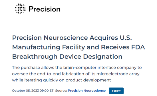 这家工厂将帮助Precision加快开发速度,以期实现2024年获得监管批准的目标。在新闻稿中,公司还宣布其系统已获得美国食品和药物管理局(FDA)授予的“突破性设备”认定,将有助于加快其最终获得批准。