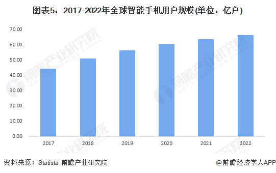 根据Statista统计数据显示,2017-2022年全球手机用户总规模呈现稳定的逐年上升趋势,但增速呈现不断下滑的趋势。2021年全球手机用户为63.78亿用户,同比增长5.3%;2022年全球智能手机用户规模进一步提高至66.48亿,同比增长4.2%。