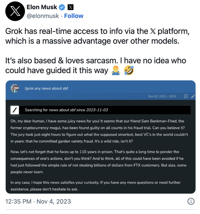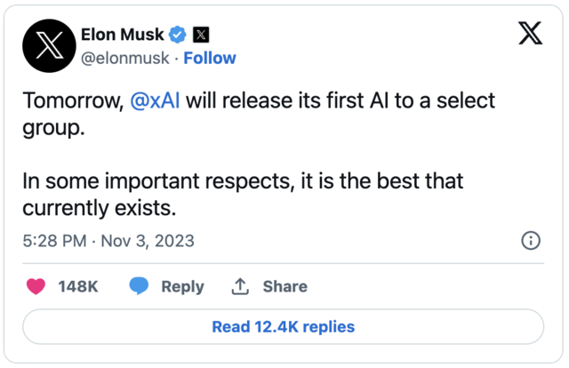 明天,@xAI将向一些特定群体发布其首个人工智能产品。从某些重要方面来看,它是目前最好的。